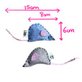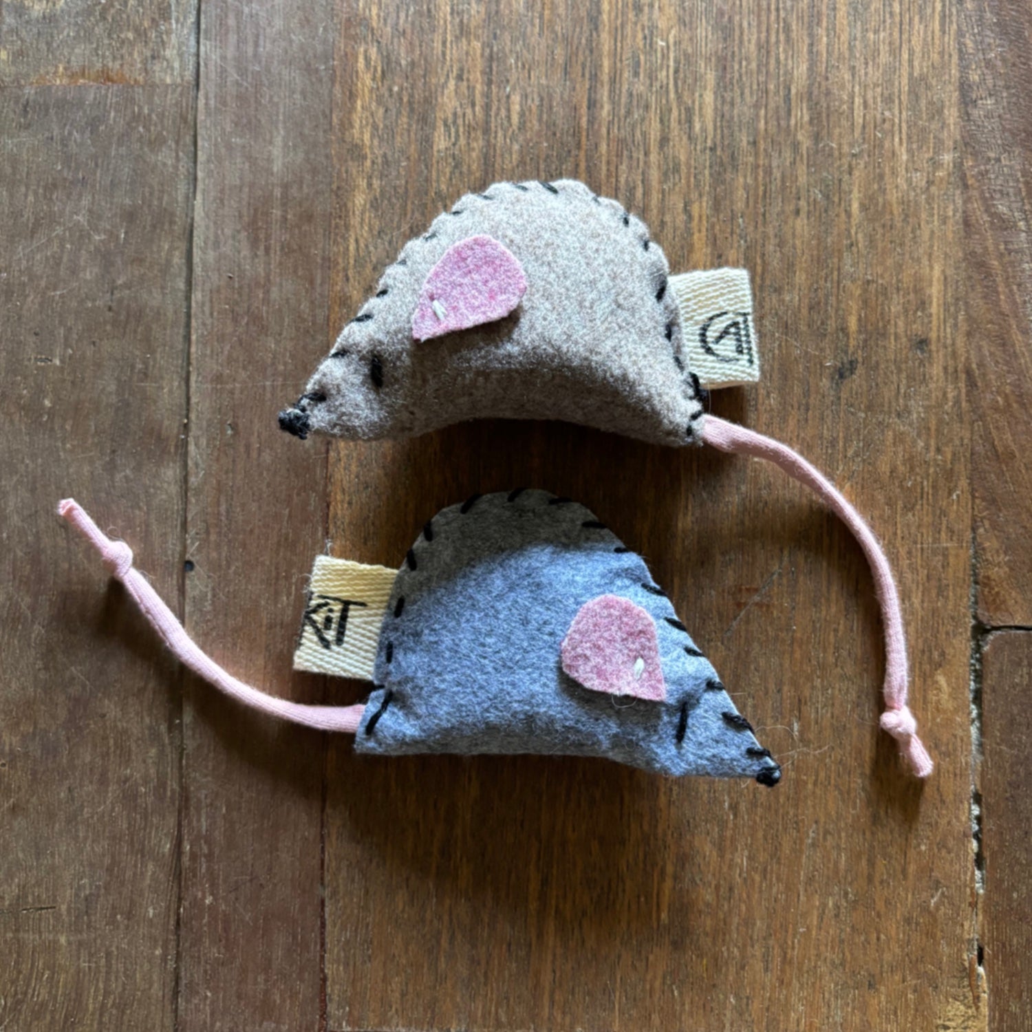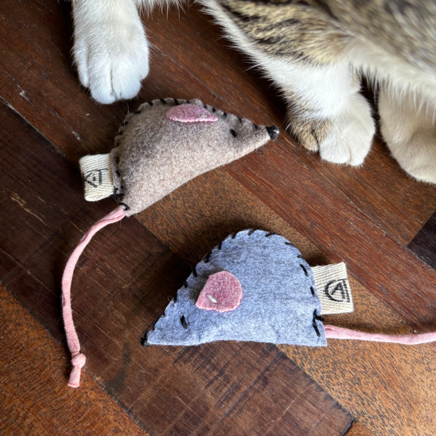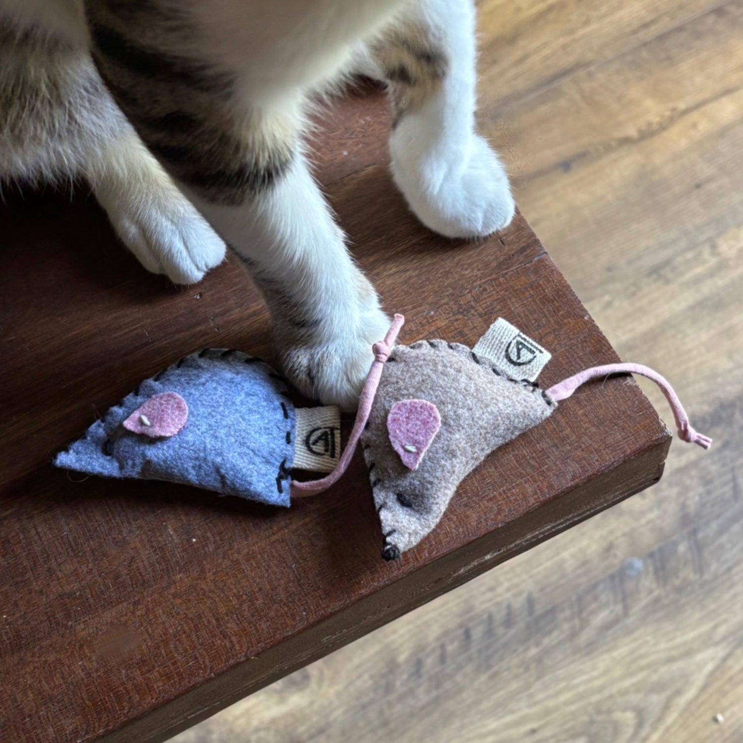 Our Nice Mice set contains two adorable felt mice. Prey sized, our toys crinkle when squeezed and jingle when shook.